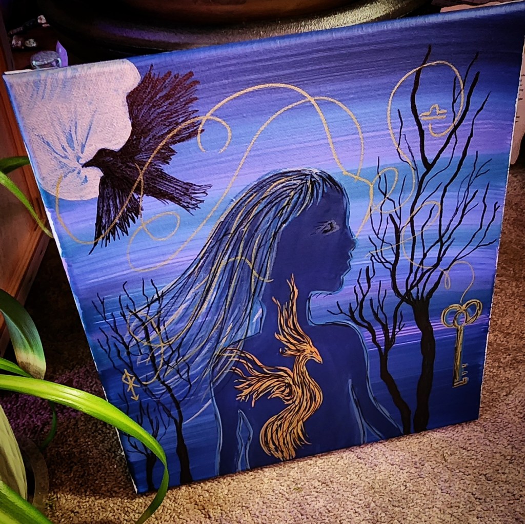 The crow against the full white moon in the upper left is both omen and ally. It holds memory and mystery. It has flown from my past to witness my becoming. The moon it flies across is full and unobscured—illumination without fear.