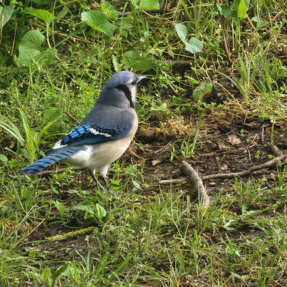 As I sat in contemplation, gazing out through the Moon Window, a Blue Jay appeared—vivid and alert, feeding on the ground near the Kenaz limbs. And then, something startled it. It took off in flight, arcing upward—